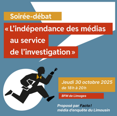 Le jeudi 30 octobre de 18h à 20h "Facto !" organise une soirée-débat sur le thème "L’indépendance des médias au service de l’investigation". L’évènement aura lieu à Limoges, à la bibliothèque francophone multimédia, dans l’amphithéâtre Clancier. Seront présent Charlotte Clavreul, directrice exécutive du Fondspresselibre et Mathis Destal, co-fondateur du média d’investigation Disclose. L’entrée est libre, dans la limite des places disponible.