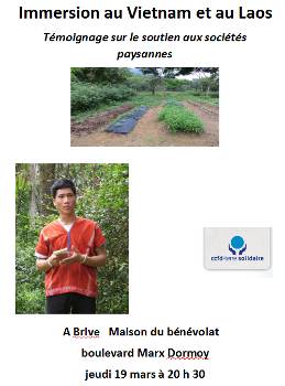 Le CCFD Terre Solidaire organise le jeudi 19 mars à 20h30, à la Maison du bénévolat, Bd Marx Dormoy de Brive une soirée sur le retour d’expériences d’un voyage au Vietnam et au Laos.